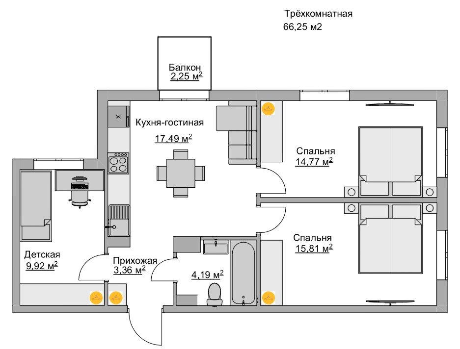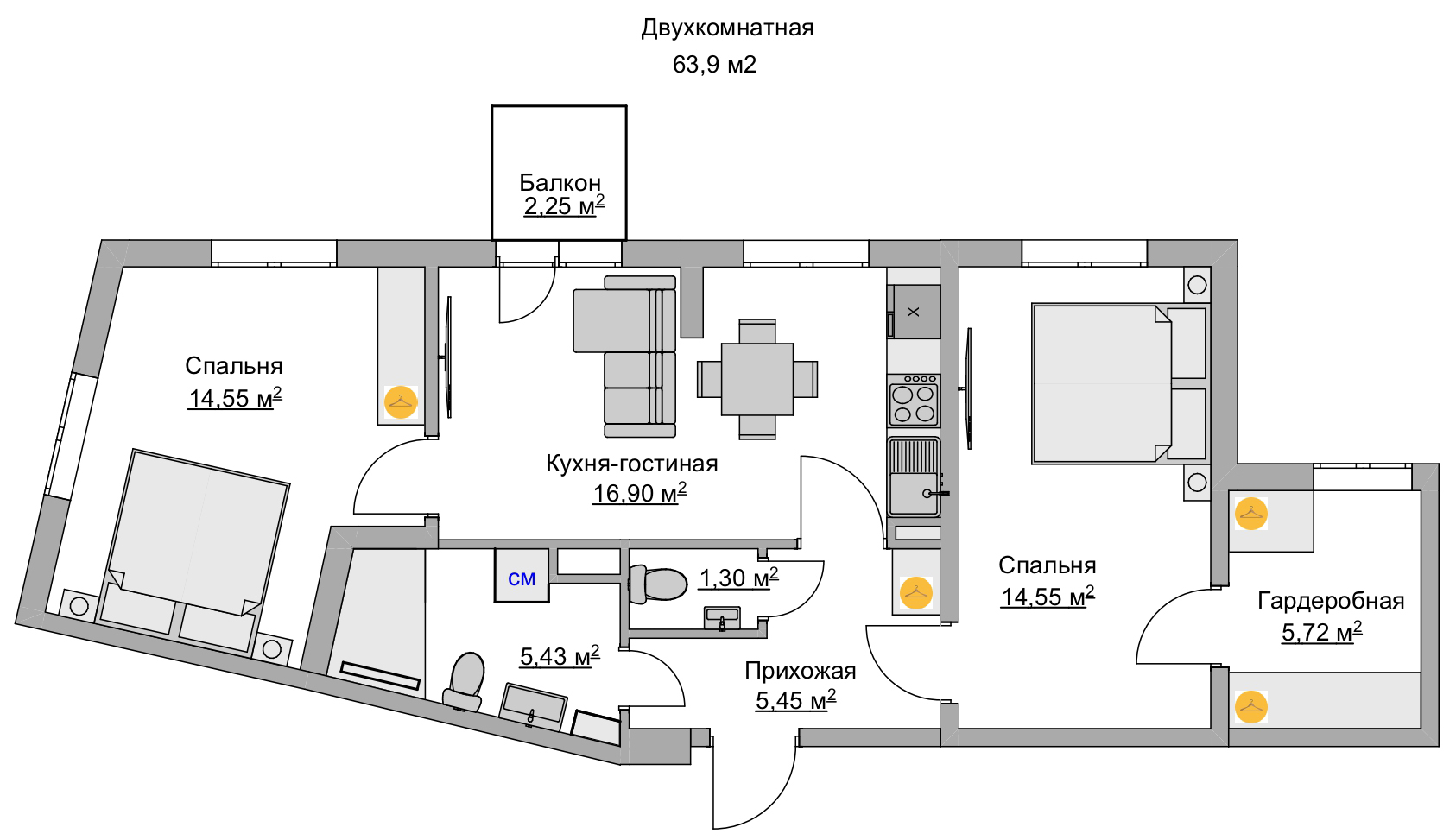 Площадь 63,9 кв. мРемонт «под ключ» стандарт:
