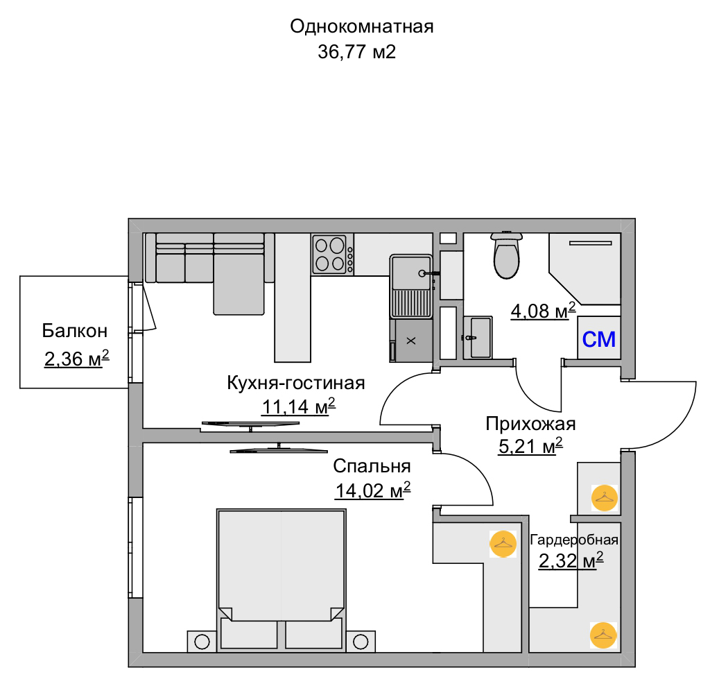 Площадь 36,77 кв. мРемонт «под ключ» стандарт: